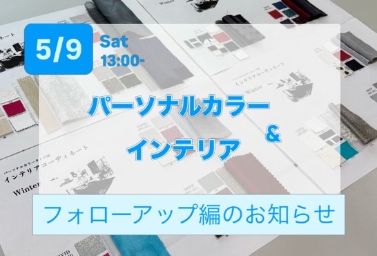セミナー 2026/5/9(土)「パーソナルカラーdeインテリア フォローアップ編」開催のお知らせ ”似合う色”を住まいに活かす「パーソナルカラーdeインテリアカラーコーデ〜フォローアップ編」のお知らせ「似合う色の住まいのカラーコーデ」セミナー、4つのカラータイプについて開催してきましたが、受けれなかった方からのリクエストにお応えして、フ... 2026.04.28 セミナー